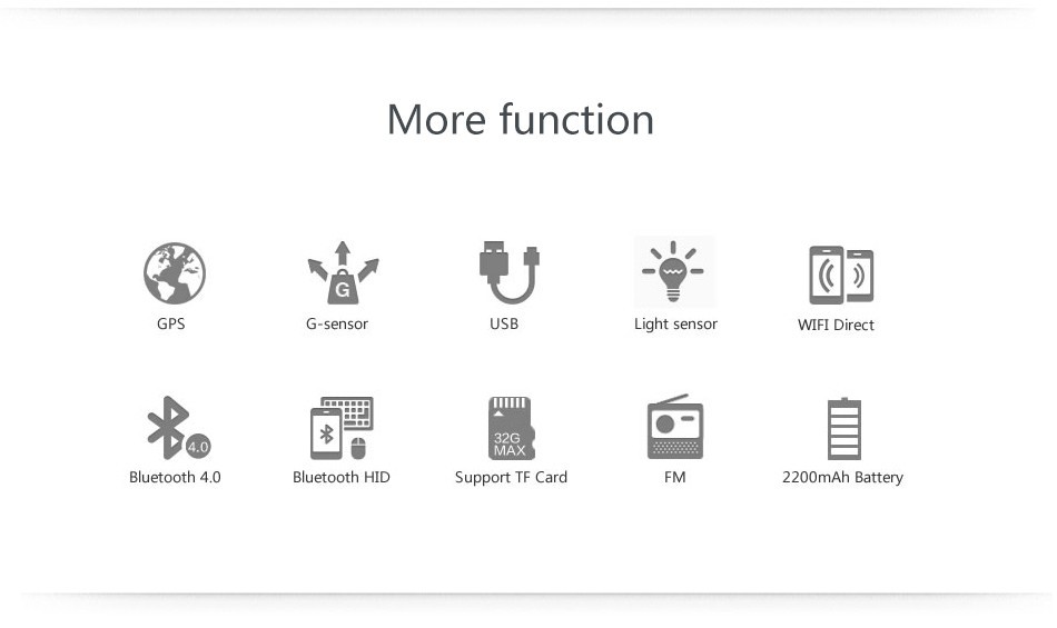 | Others | 3G,WiFi,GPS,OTG,OTA,Gesture Sensor,FM,Bluetooth,Ebook, Email, Messaging |